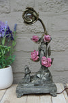 gorgeous french music box statue with lamp spelter and majolica flowers is a souvenir from LOURDES, the well...