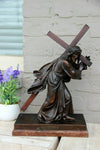 Gorgeous Antique French religious statue of Crhist carrying a wood crossspelter with bronze patina , on a marble...