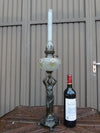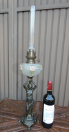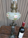 antique 1900s French oil petrol lampWith a spelter bronze lady figurine holding the lampGLass with enamel flowers decorationcrack...
