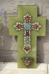 antique religious holy water font cloisonne enamel decorated cross and font onyx marble on a copper plate 24.5...