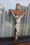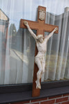 antique belgian wall crucifixwood carved cross and  a ceramic chalk corpus christvery detailed look at pics89 x 40,5...