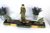 Antique french art deco Sculpturehunter throwing spear deer Spelter bronze on a black marble base overall good antique...
