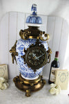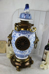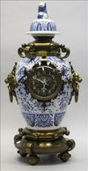 WOW, a stunning Antique CLockwith delft blue white pottery with birds and floral decorbronze base and lion heads...