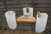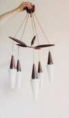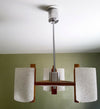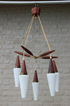 Very beautiful Mid century retro chandelier pendantwith teak and white opaline glass shadesmodel attr. Louis KAlff 90 cm...