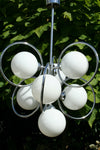TOP PIECE from 1960'sRetro sputnik atomic chandelier with 7 opaline glass globes75cm long till canopy and 58cm widest...