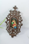 Antique black forest wood carved religious plaquewith inside a porcelain medaillon with hand paint madonna and childthere is...