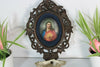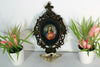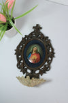antique black forest wood carved / porcelain medaillon sacred heart christ holy water font hand paint christ portrait...