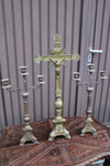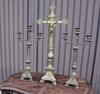 antique church altar setbronze altar crucifix with side candle holders tripod bases with portraits of mary / jesus...