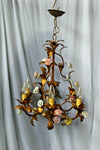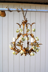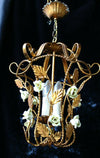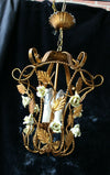 vintage 1970s Italian MEtal gold gilt chandelier with yellow porcelain flowers very cute romantic cage form with inside...