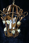 Vintage 1970s metal gold gilt & porcelain  roses chandelierin a basket very beautiful piece64 cm wide and 68...