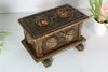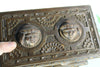 french vintage wood carved boxwith portrait heads lion pawswith key ( system to close is loose so doesn't...