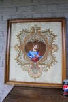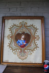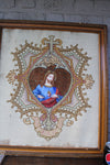 very old french embroidery handwork religious frame with a sacred heart christ some wear due to age see...