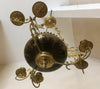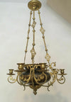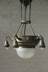 Antique French Chandelierwith brass dragon figurines holding a 2 arm lamp centrally a faience bowl with enamel decor...