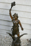 French vintage clock setcirca 1960'swith matching side vasesart nouveau lady figurines and bird spelter with bronze patina46cm height...