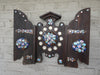 vintage Wood triptych wall clock with metal enamel flower decorated plaquettes is a piece from 1970s works with...