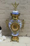 BOCH faience antique clock setmarked with boch stampdelft blue white design with floral and bird decorbronze lion heads...