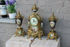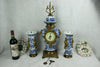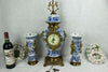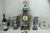 Stunning set from France porcelain clock set with matching side urns / vaseswith romantic scenes on cobalt blue...