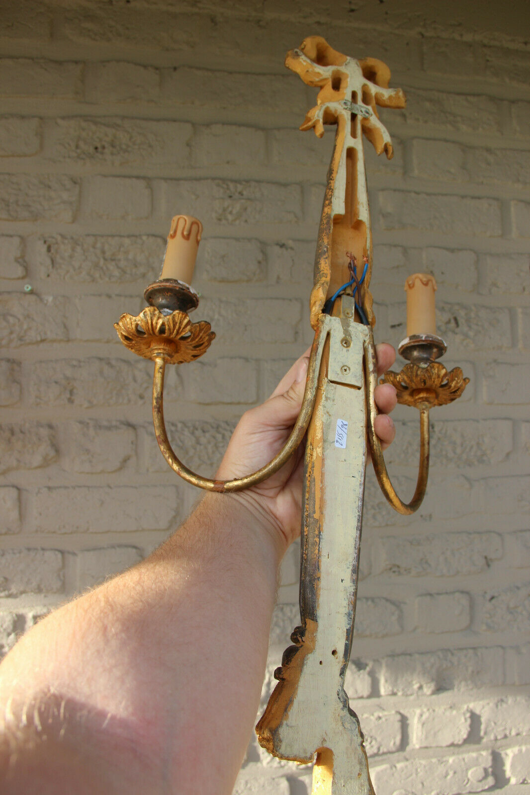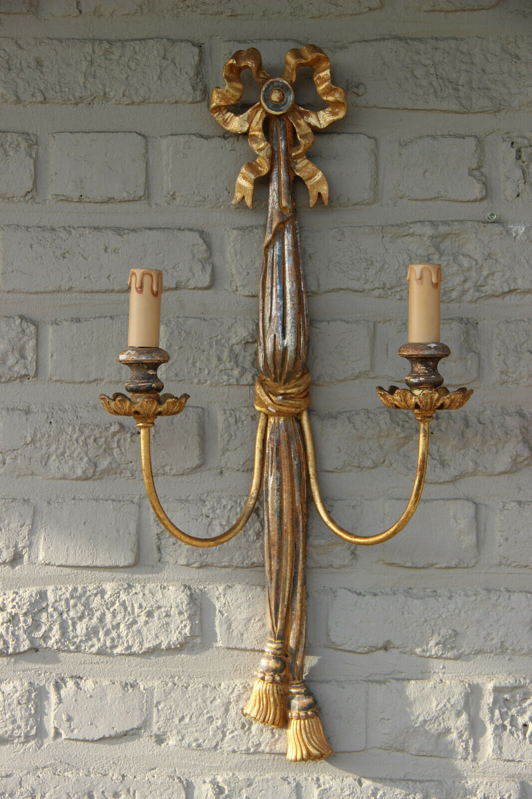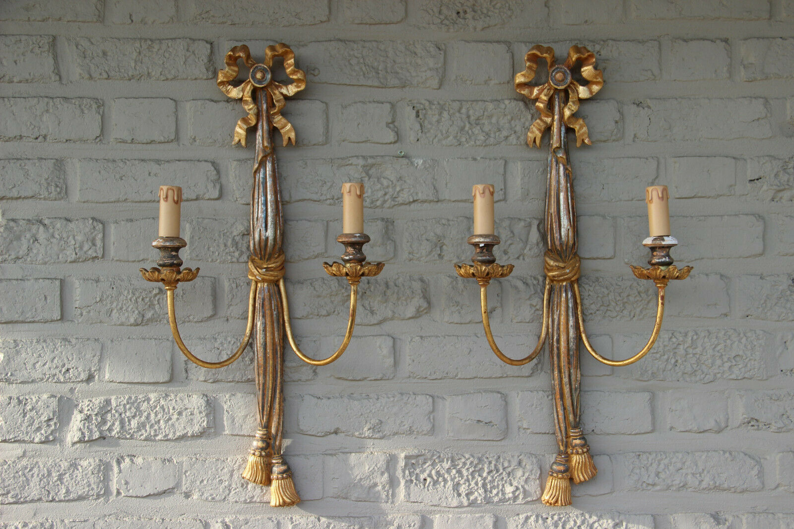 huge pair italian Maison chelini Wood Carved Louis XVI wall sconces lights 1970