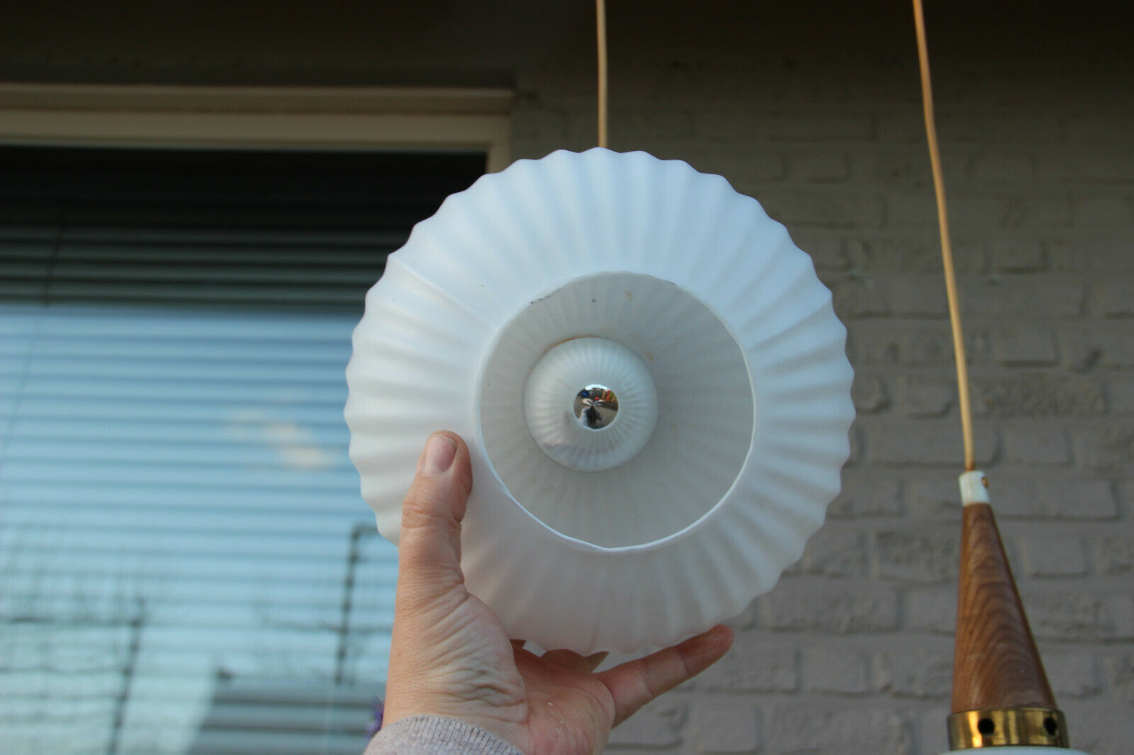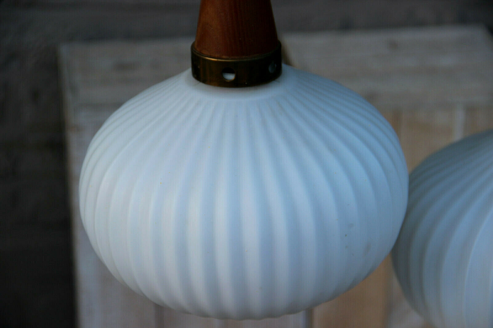 PAIR Retro 1970 Scandinavian teak milk glass shades pendant lamp chandelier