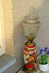 gorgeous antique japanese kutani porcelain oil lampwith glass shade on top with peacock decorglass flute also includedlamp is...
