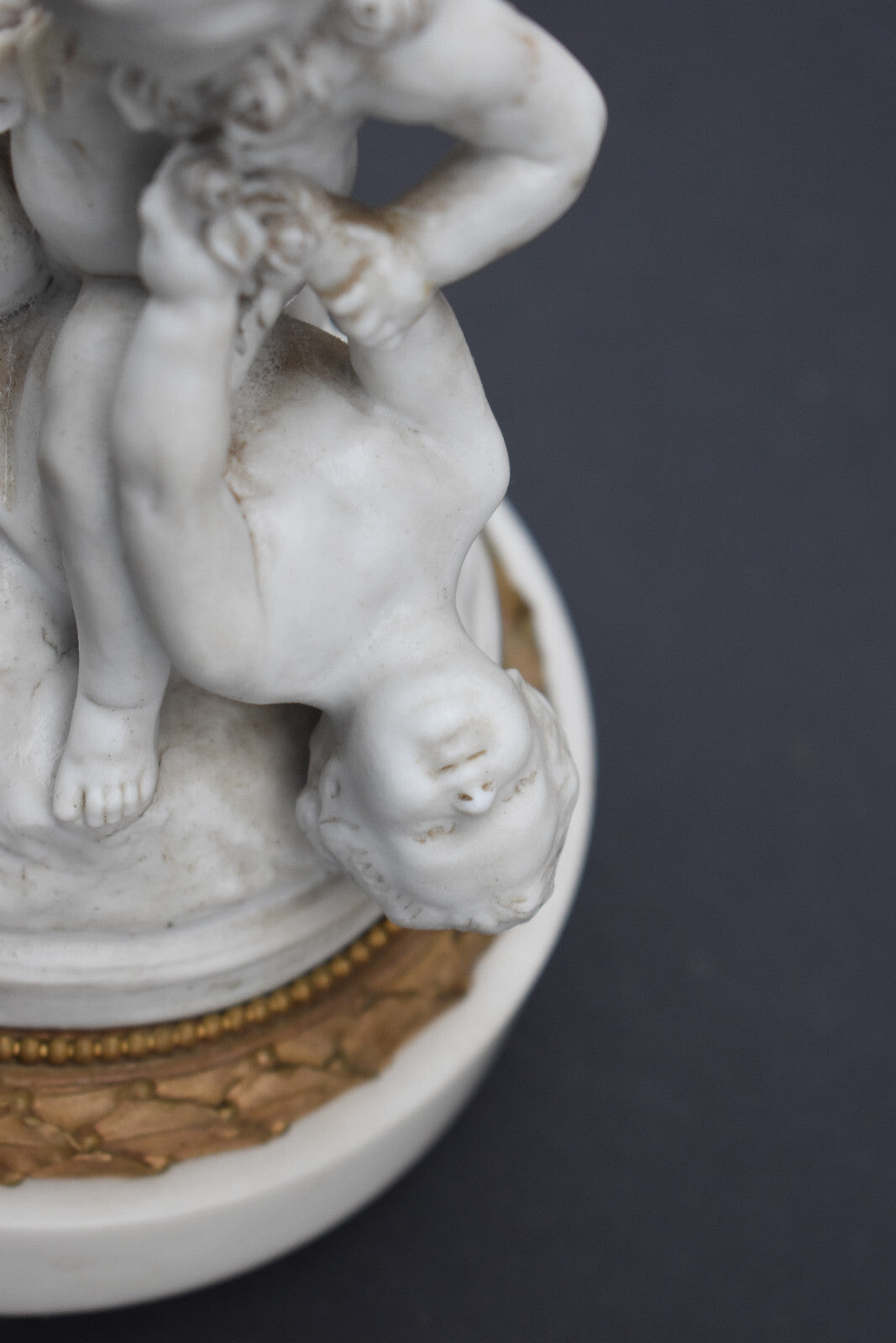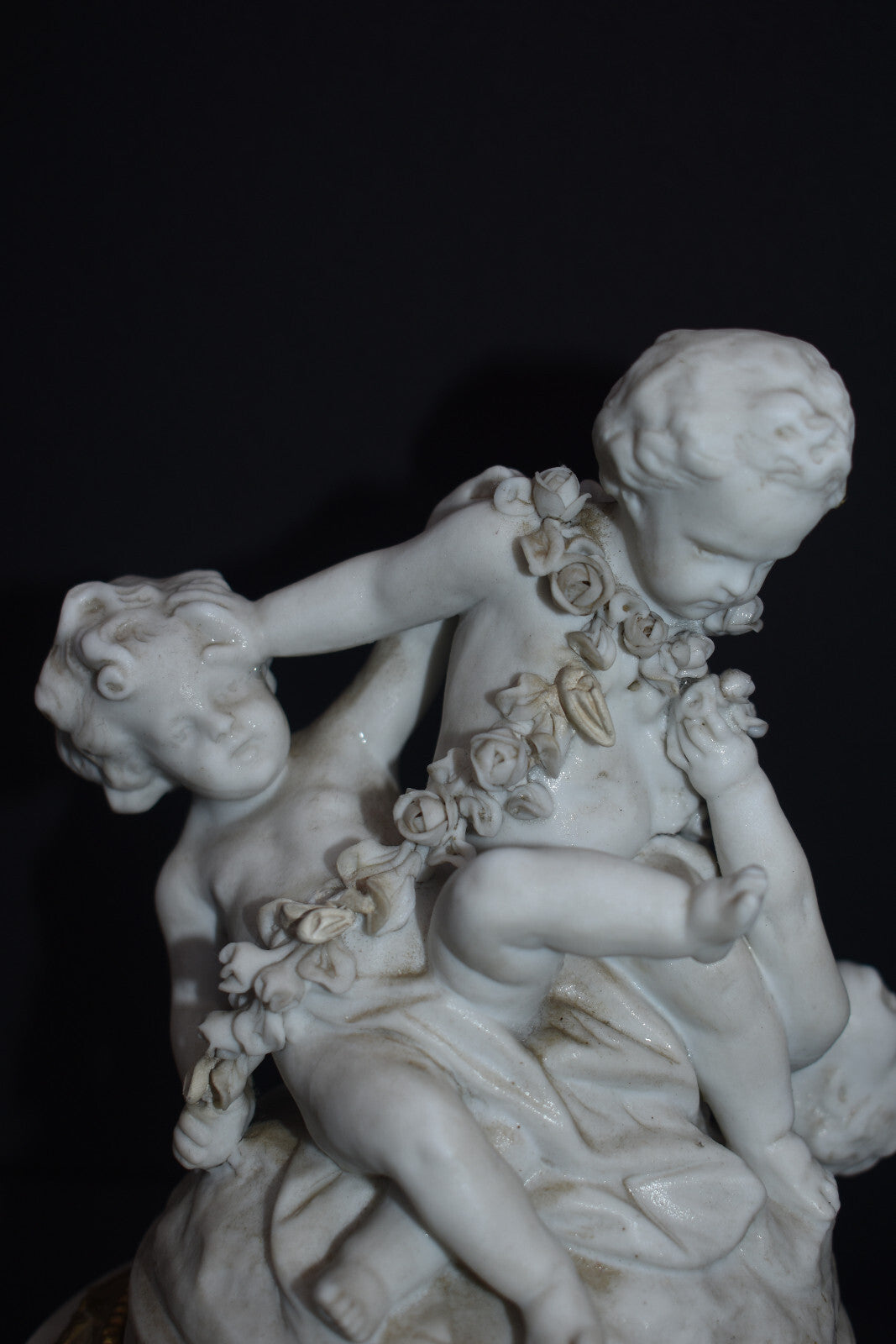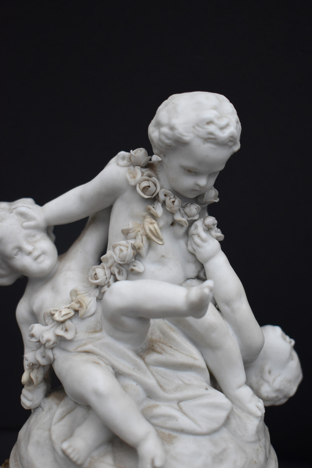 Antique bisque porcelain putti group statue playing marble base