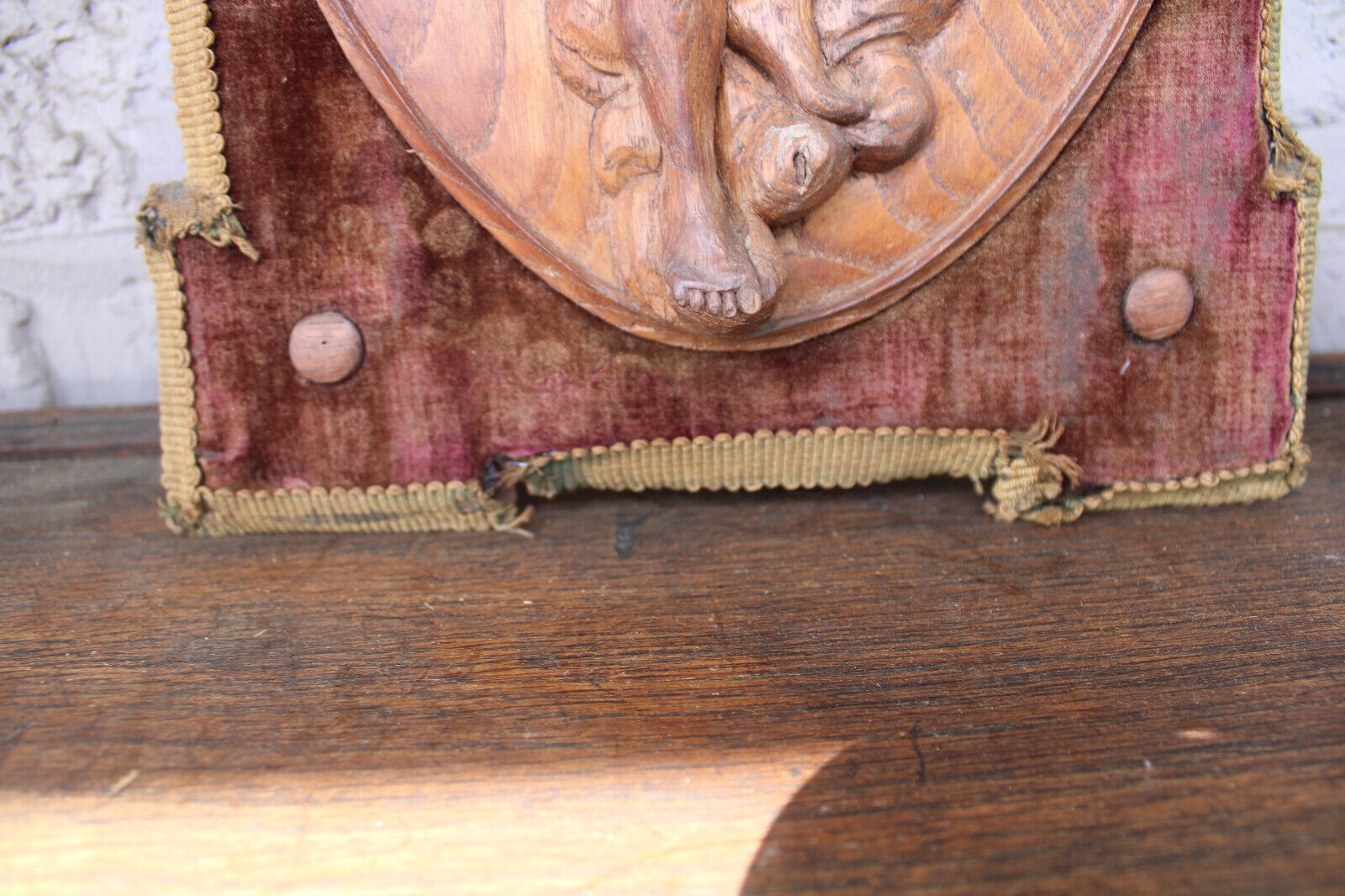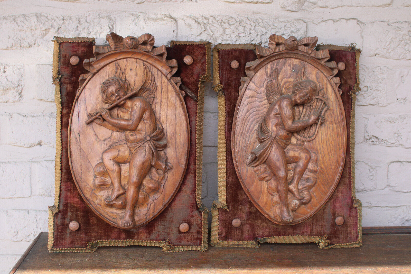PAIR antique wood carved putti angel musician figural wall panel plaque velvet