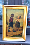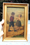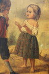 Gorgeous antique romantic oil panel painting boy & girl 30 x 20 cm with frame 19thc cute small...