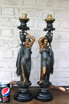 antique pair lamps with lady carrying amphore vase spelter metal on marble base work with e14 bulbs 52...