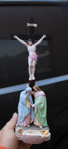 large french antique crucifix with holy water fontcalvary scenewith vieux paris porcelain font and bisque corpus christwood crossvery...