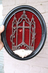 antique 19thc neo gothic wall holy water fontin a wood framewith a shell as font wood carved crucifix...