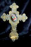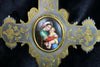 Gorgeous antique french metal crucifix with gold inlaid floral decor medaillon in porcelain with madonna with childalso a...