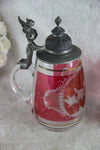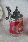 Gorgeous German Beer jug Crystal etched glass with a hunting theme bird figurine in red colour on the...