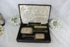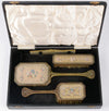 ANTIQUE VICTORIAN GOLD FILIGREE NEEDLEPOINT VANITY HAND MIRROR & 2 BRUSH & comb setstill in original box 36...