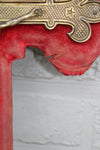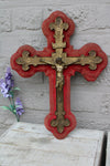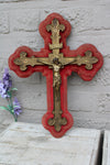 Very old antique french wall crucifix brass with fleur de lys symbols at the end points on red...