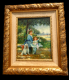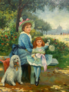 vintage flemish school oil panel paintingromantic portrait painting mother with daughter and poodle dogvery beautiful paintingsigned right below1970s41...