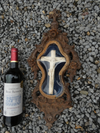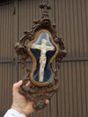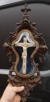 Antique Rare to find wood carved religious frame with mother of pearl crucifixvery beautifulsigned by artist at back...