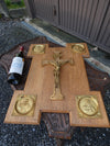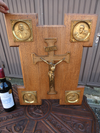 antique rare to find religious wood plaque with bronze plaques of the 4 evangelists and a crucifixheavy quality...
