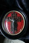 Gorgeous frenchFrench antique napoleon III crucifix in a black lacquered frame and behind convec glassi think it is...