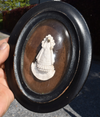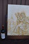 Antique large chalk plaque in a wood framefor wall hangingmadonna with child in relief looking at cathedral signed...