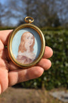 Antique french holy water fontmetal gold gilt neo gothic frame with hand paint portrait madonna on porcelain18 x...