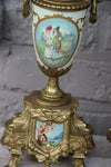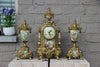 Stunning set from France porcelain clock set with matching side urns / vaseswith romantic scenes on beige /...