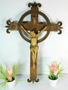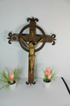 antique french wood carved crucifixwith wood inlay pieces ( small imperfections )chalkware christwith fleur de lys end points...