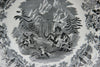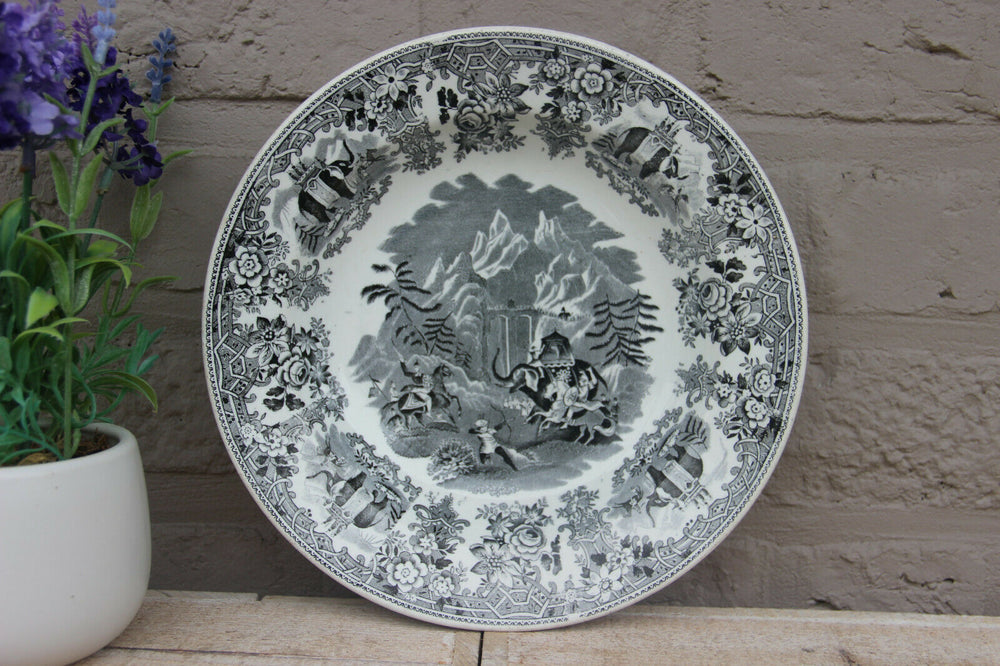 Antique black-and-cream transferware plate in the Hannibal pattern showing Hannibal crossing the Alps with elephants and horses made...