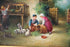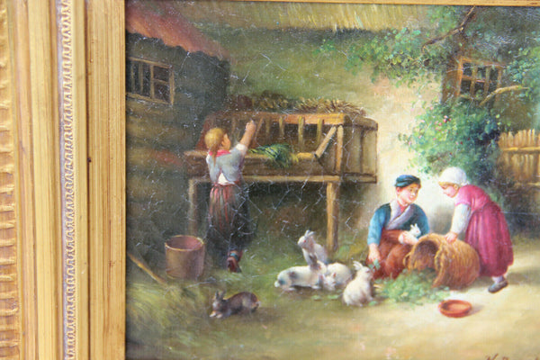 Antique oil panel painting farm scene feeding rabbits kids signed