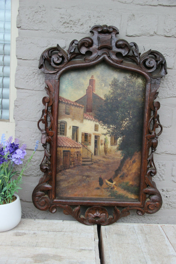Rare antique black forest wood carved Frame with oil panel painting chickens