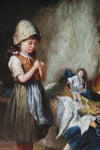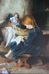 Vintage oil on canvas painting with a typical flemish interior children playing with doll scene painting itself is...