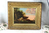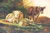 Gorgeous German oil on panel painting unsigned cows resting in the field, at background a farmers'wife milking a...