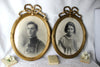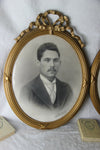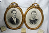 PAIR antique Flemish portrait pencil drawings of ancestors 1920's in a gold gild stuc ( chalkware ) bow...