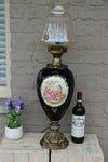 XL french porcelain table lampin dark blue limoges porcelainwith a romantic victorian scene on top a glass shadeis...