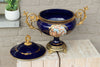 huge french vintage centerpiece bowl in dark blue limoges porcelain with romantic scene lidded44 cm wide from handle...